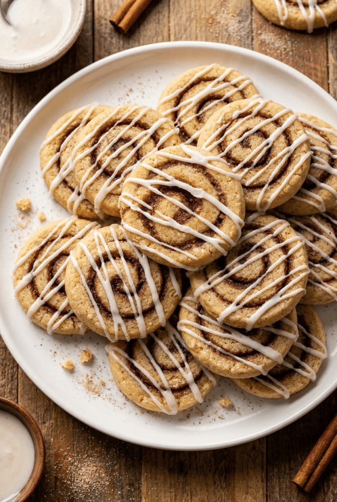 Swirled with cinnamon sugar and finished with a light icing drizzle, these cookies taste like mini cinnamon rolls in cookie form.
