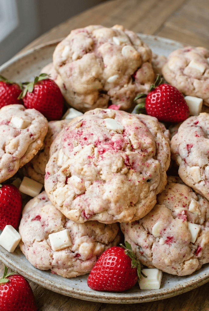 Soft, slightly crumbly cookies with bursts of strawberry flavor that feel light, fresh, and perfect for pairing with coffee.