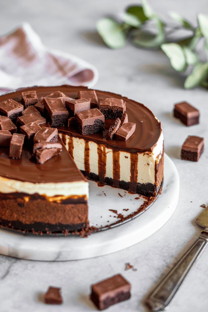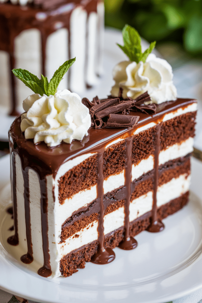 This chocolate tuxedo cake is a stunning dessert that layers rich chocolate cake with silky white and dark chocolate mousses, all finished with a glossy chocolate ganache. The contrast between the dark cake and creamy mousse layers gives it that classic “tuxedo” look while delivering deep chocolate flavor in every bite. It’s the kind of elegant dessert that works beautifully for birthdays, parties, or any celebration where you want a dramatic chocolate centerpiece. You can see the full recipe at Tasty Home Cooks.