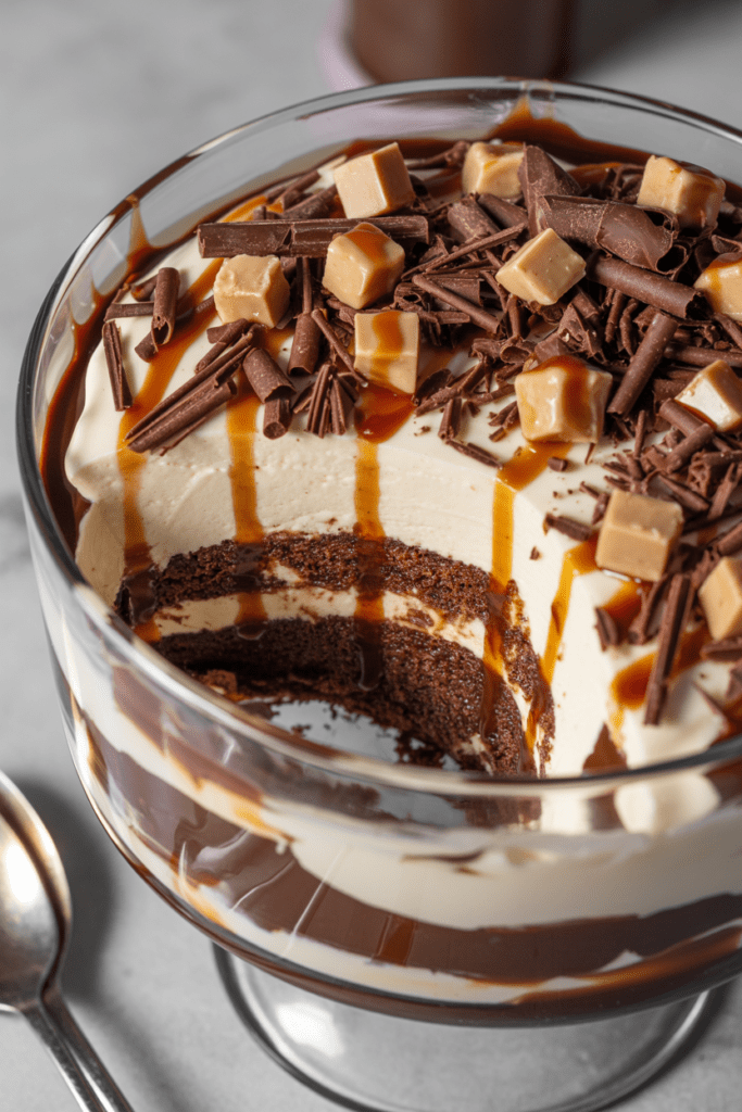 This chocolate toffee trifle is a show-stopping dessert that’s perfect when you need something rich and impressive for a crowd. Layers of moist chocolate cake, creamy chocolate pudding, fluffy whipped topping, and crunchy toffee bits come together in one decadent bowl that’s easy to scoop and serve. The contrast of soft cake, silky cream, and buttery toffee makes every bite irresistible. You can see the full recipe at The Fervent Mama.