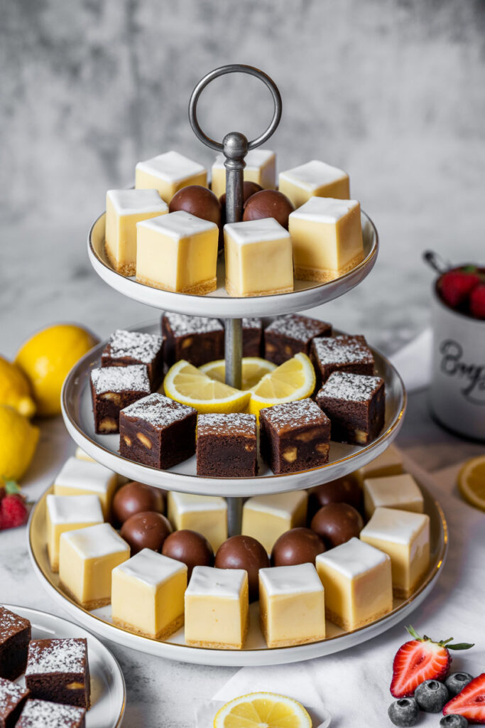 - Style like a pro – Pile brownie bites and lemon bars onto a tiered cake stand for an instant “wow” factor.
