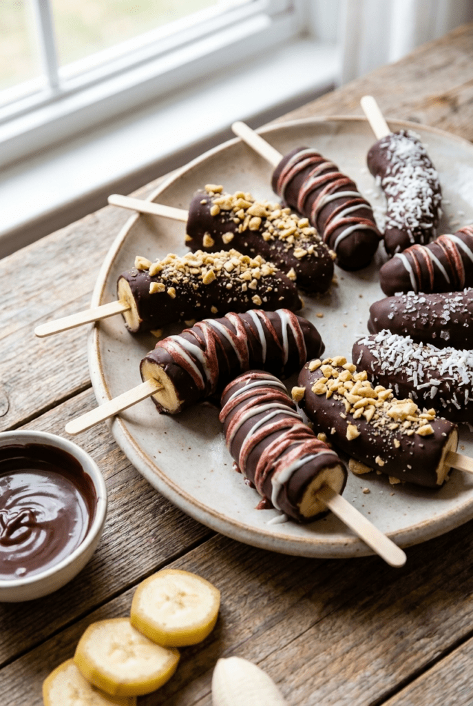 What makes these so good (and honestly, so dangerous) is the texture. The bananas freeze into a soft, almost ice-cream-like center, while the chocolate hardens into that satisfying “snap” on the outside. Add toppings like sprinkles, nuts, or coconut, and suddenly you’ve got a customizable dessert that feels way fancier than it actually is.