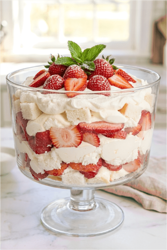 This strawberry punch bowl cake recipe is one of those classic, crowd-feeding desserts that instantly feels like summer in a bowl. It’s layered with fluffy angel food cake, creamy vanilla pudding, whipped topping, and fresh strawberries—creating that light, sweet, melt-together texture everyone loves.