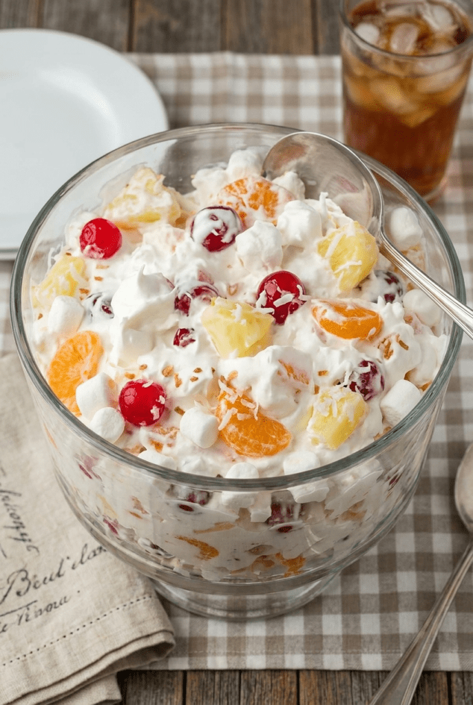 This classic ambrosia salad recipe is the kind of nostalgic, no-fuss dessert that shows up and quietly steals the whole party. It’s creamy, fruity, fluffy—and honestly, exactly what you want when it’s too hot to even think about turning on the oven. Made with whipped topping, tangy sour cream, juicy pineapple, mandarin oranges, marshmallows, coconut, and cherries, it comes together in minutes and chills into that perfectly light, scoopable texture everyone goes back for.