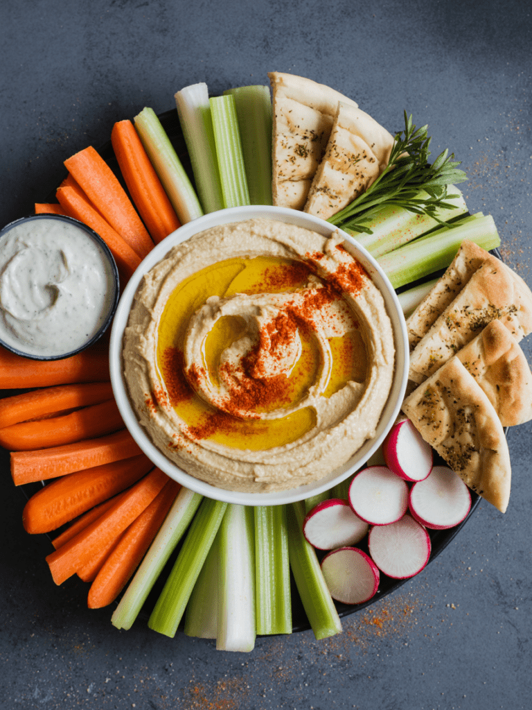 Spacing is everything here. Instead of dumping vegetables in piles, group by color. Let orange carrots sit beside pink hummus. Let green snap peas frame white feta.