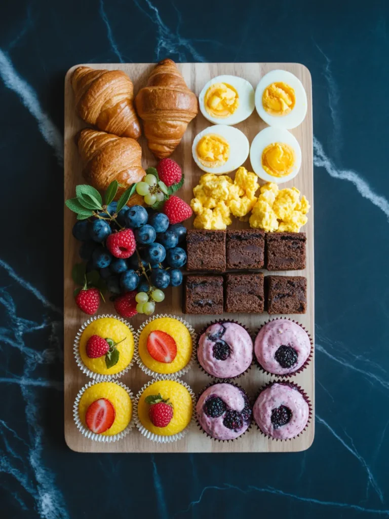 The trick with brunch boards is contrast. Tart lemon against rich chocolate. Fluffy cupcakes next to creamy brie. Juicy berries beside buttery pastry.