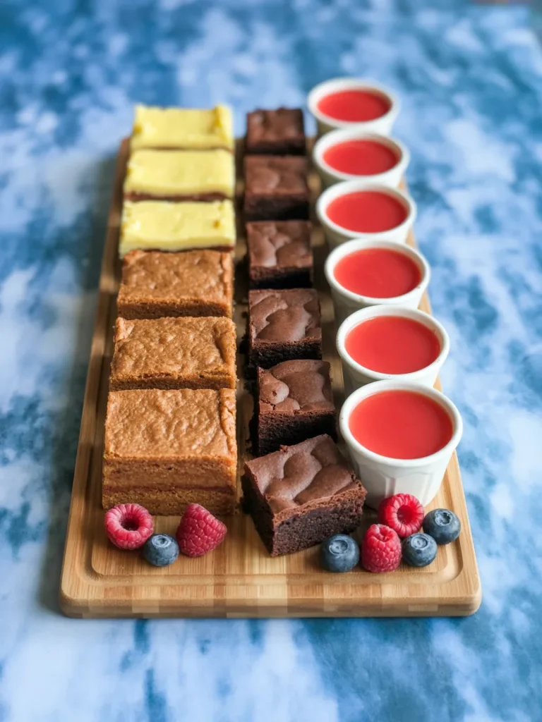 Keep colors clustered. Let raspberries live near lemon desserts. Let darker tones like brownies anchor one side so the board doesn’t feel washed out.