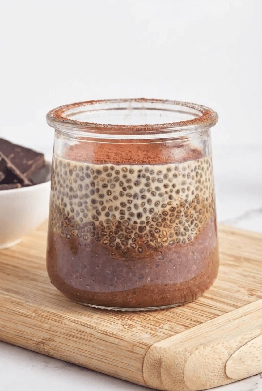 Instead of ladyfingers soaked in espresso, this version uses chia seeds to create a naturally thick pudding base infused with coffee flavor. Once chilled, it’s layered with a lightly sweet mascarpone cream that gives the dessert that unmistakable tiramisu richness.